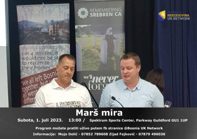 Dragi prijatelji bosanci i hercegovci u Velikoj Britaniji Želimo da vas obavijestimo da u Subotu 1. jula sa polaskom u 13.00 planiramo organizovati Marš mira u gradu Guildford koji bi trajao oko 90 minuta i na taj način odamo počast žrtvama genocida u Srebrenici kao i drugim krajevima naše Bosne i Hercegovine. Program možete…