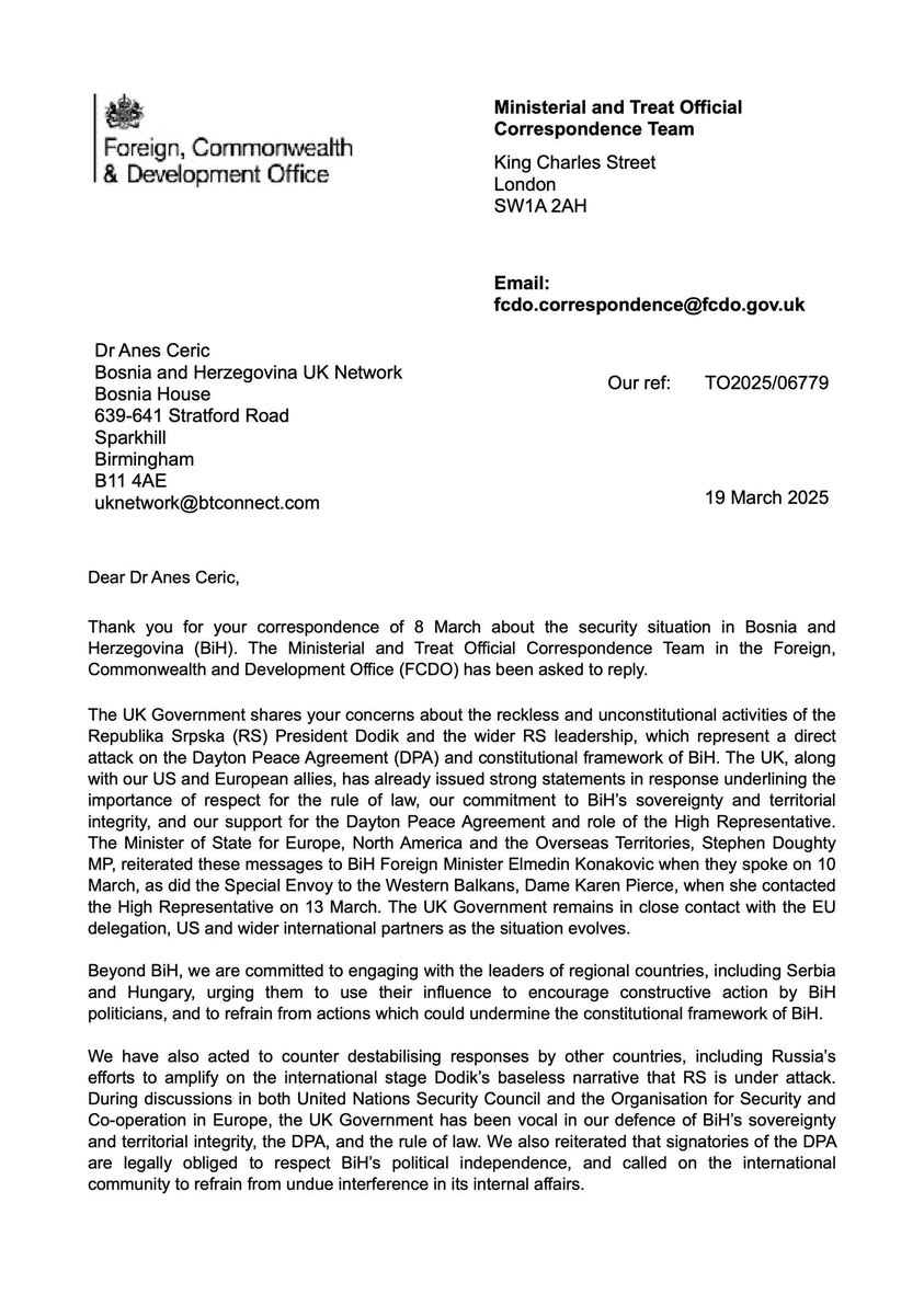 The Bosnian-Herzegovinian community in the UK has sent a series of letters to British parliamentarians and the UK Government, expressing serious concerns about the secessionist activities of Republika Srpska President Milorad Dodik. In response, more letters of support have been received from British parliamentarians, and now an official response from the Foreign and Commonwealth Office.