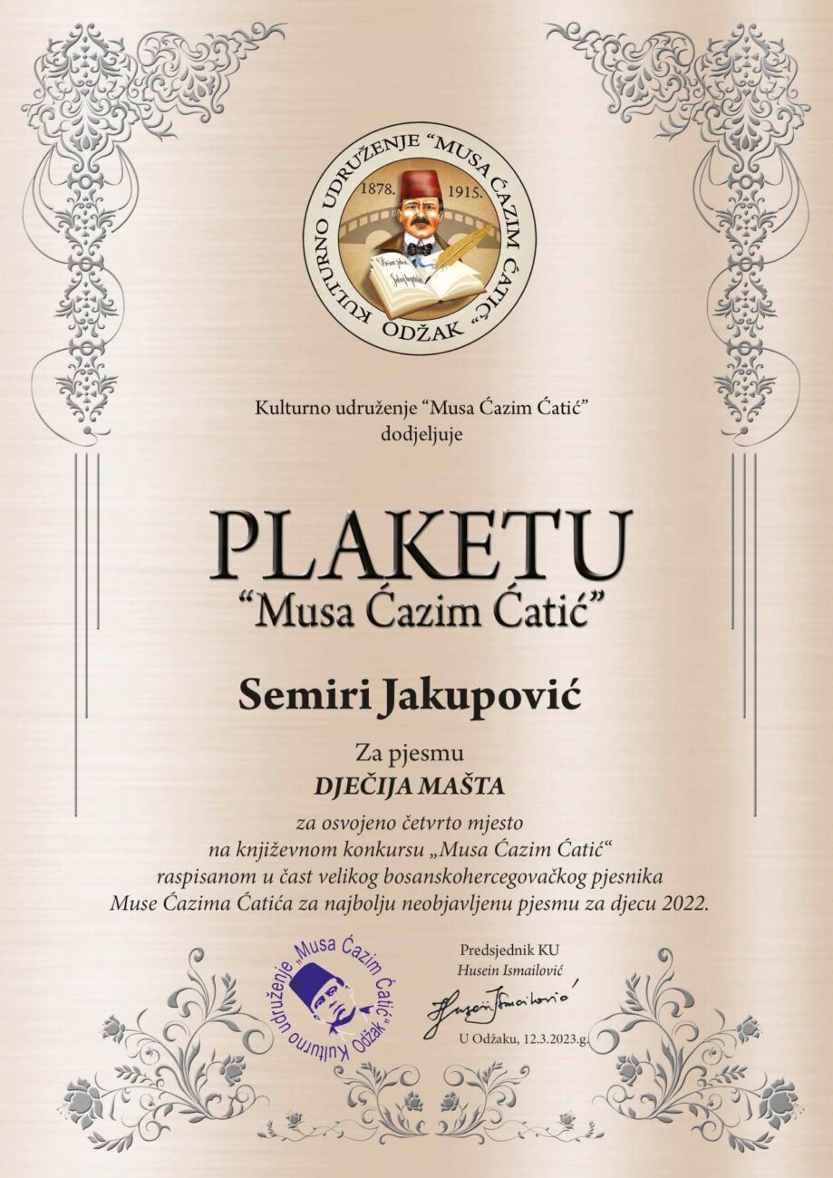 The Cultural Association “Musa Ćazim Ćatić” awarded the “Musa Ćazim Ćatić” PLAQUE to Semira Jakupović, for winning fourth place with the award-winning poem “CHILDREN’S IMAGINATION” at the “Musa Ćazim Ćatić” literary competition announced in honor of the great Bosnian and Herzegovinian poet Musa Ćazim Ćatić for the best unpublished poem for children in 2022.