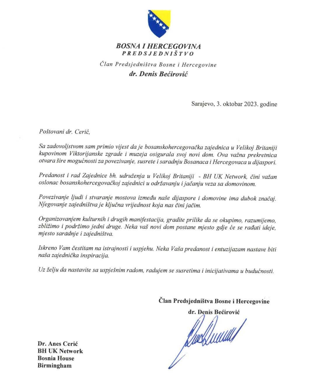 On the occasion of the purchase of a Victorian building that will be the new home of the Bosnian-Herzegovinian community in the UK, we were delighted to receive a congratulatory message. Member of the Presidency of Bosnia and Herzegovina, Dr. Denis Bećirović.